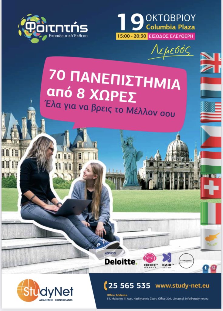 Η TomiSchool, εγκαινιάζοντας την συνεργασία με την StudyNet στη Κύπρο, συμμετέχει για δεύτερη φορά, στην ετήσια έκθεση πανεπιστημίων που διοργανώνει η StudyNet σε Λεμεσό (19/10) και στην Λευκωσία (20/10). Στην έκθεση θα έχετε την ευκαιρία να ενημερωθείτε για τα προγράμματα των συνεργαζόμενων με την TomiSchool Πανεπιστημίων καθώς επίσης και για το πρωτοπόρο πρόγραμμα προετοιμασίας που […]